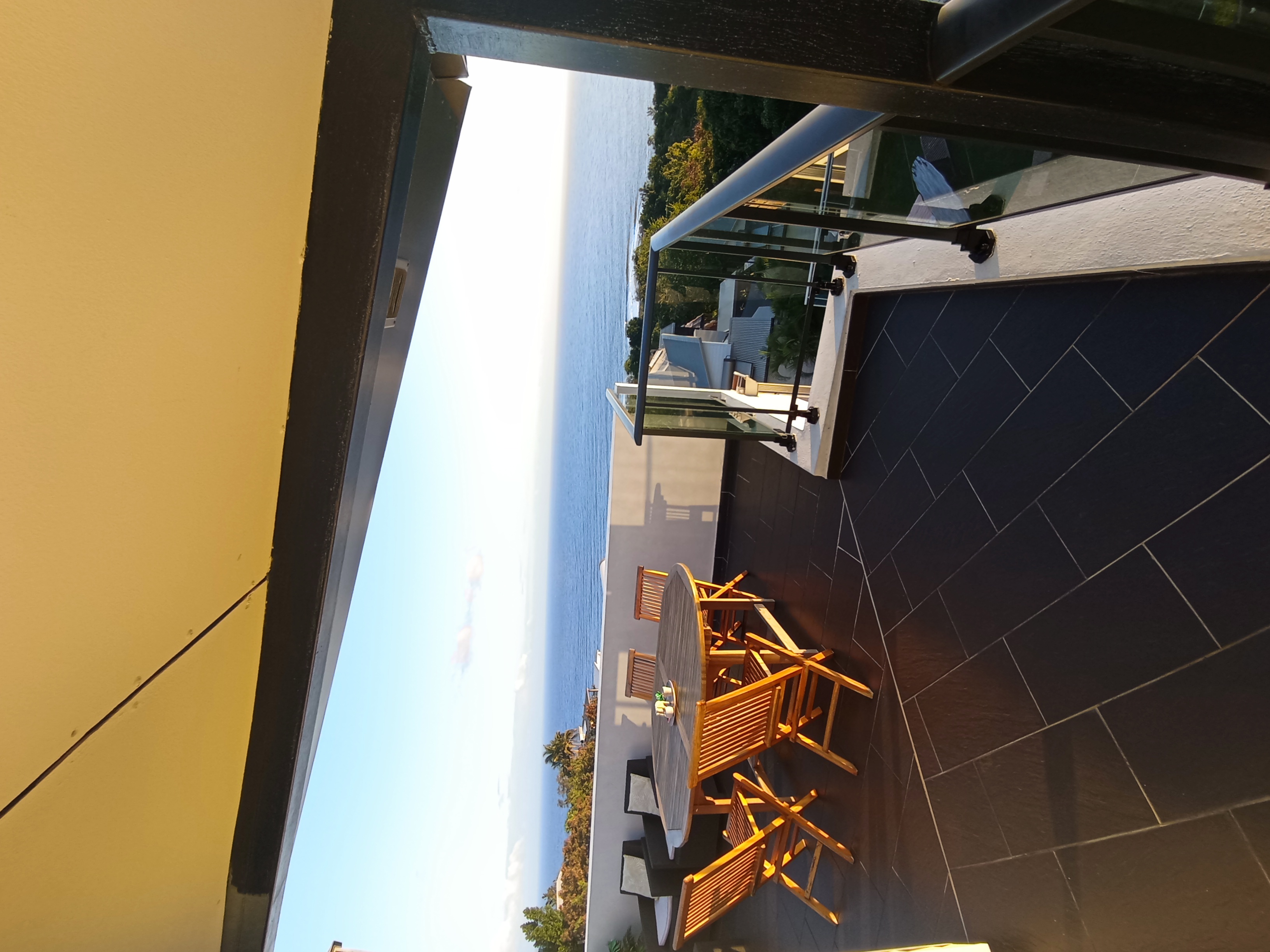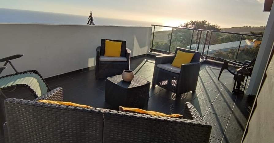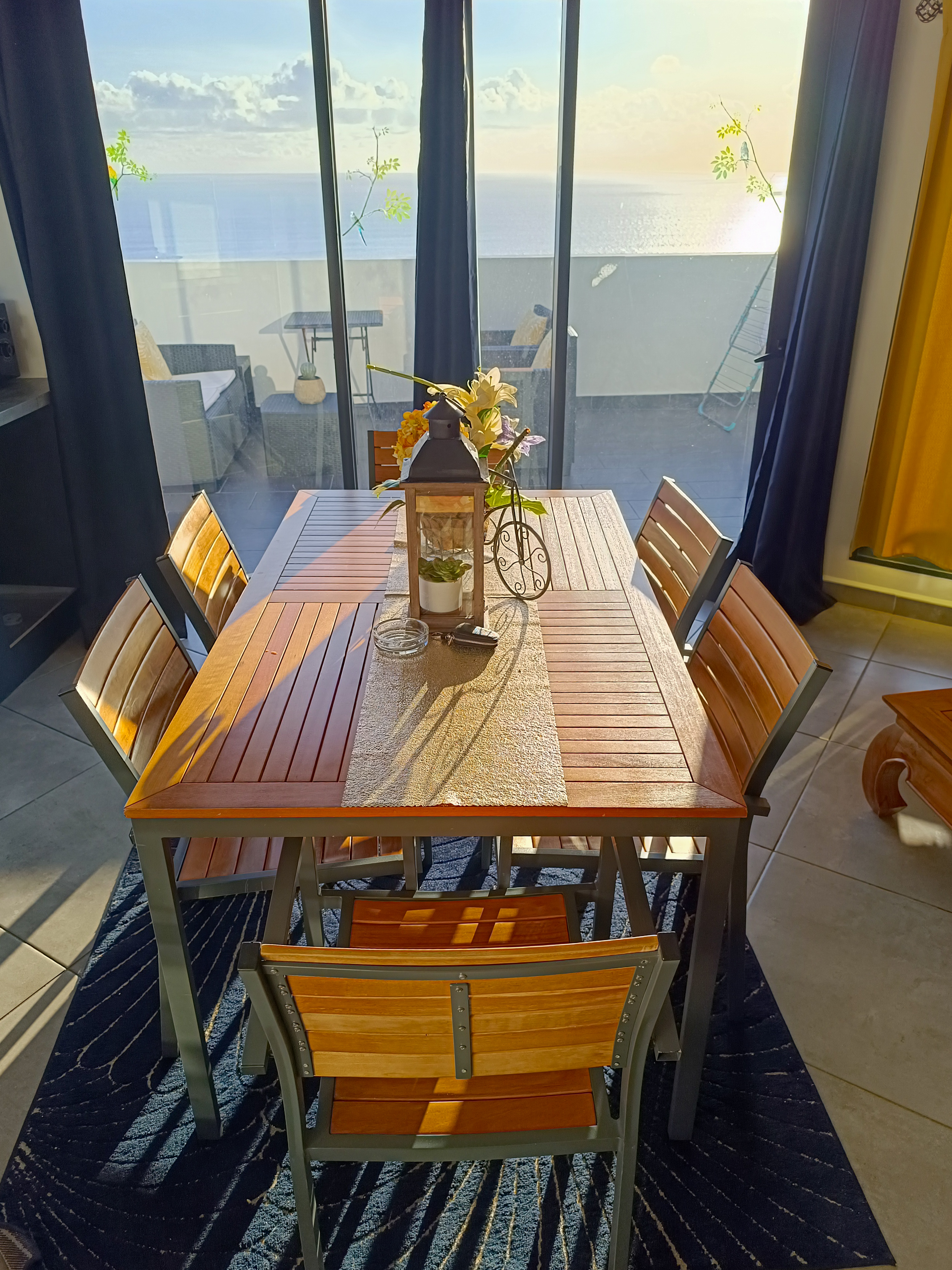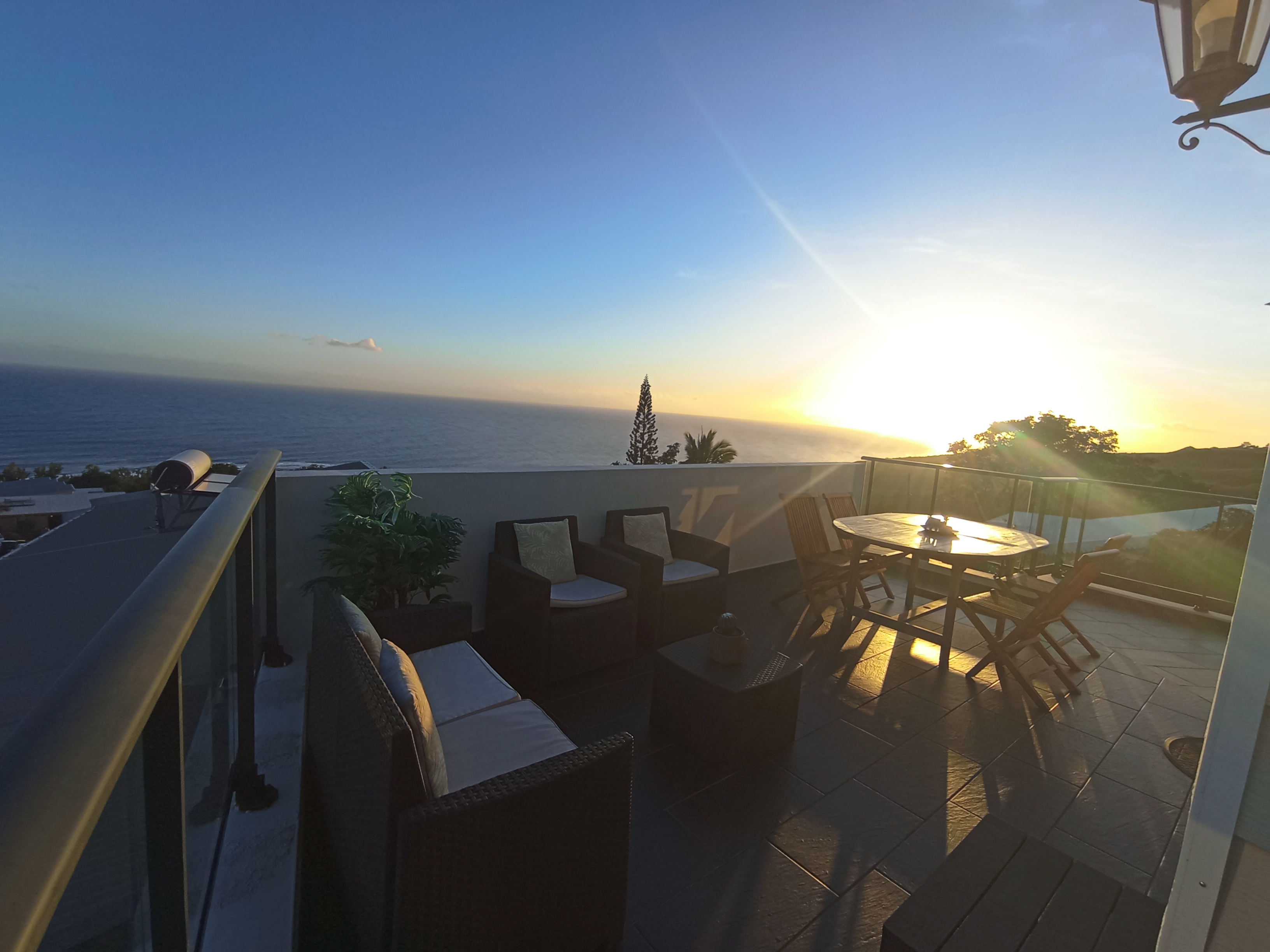 Coin terrasse extérieur, avec fauteuil et table idéal pour apprécier les magnifiques couchers du soleil